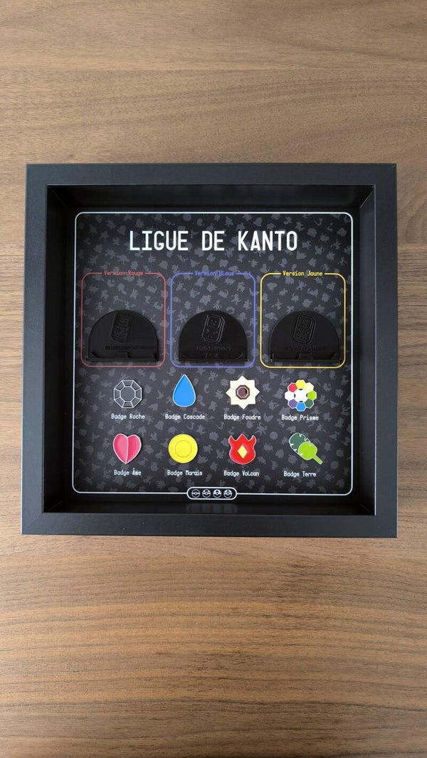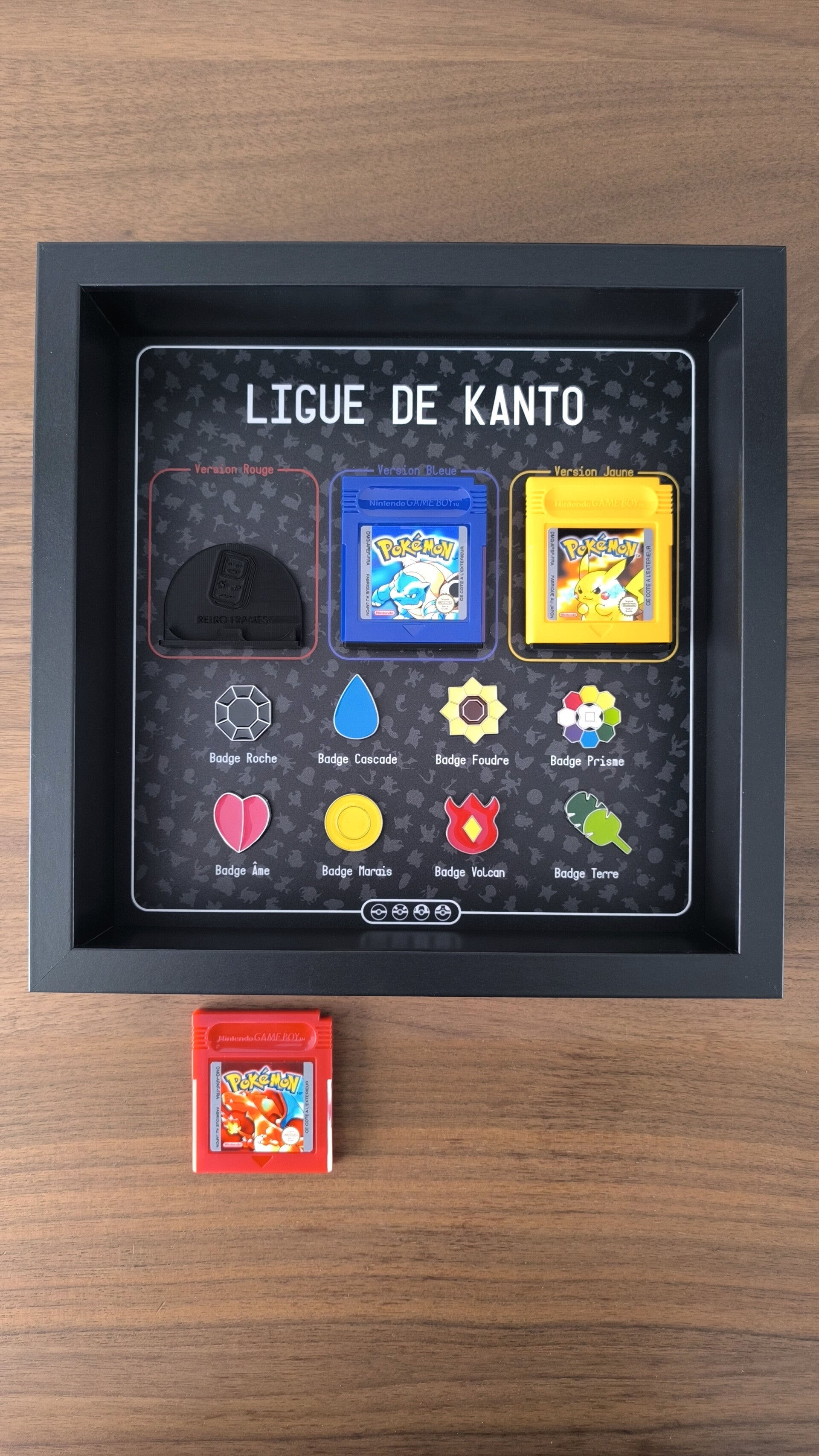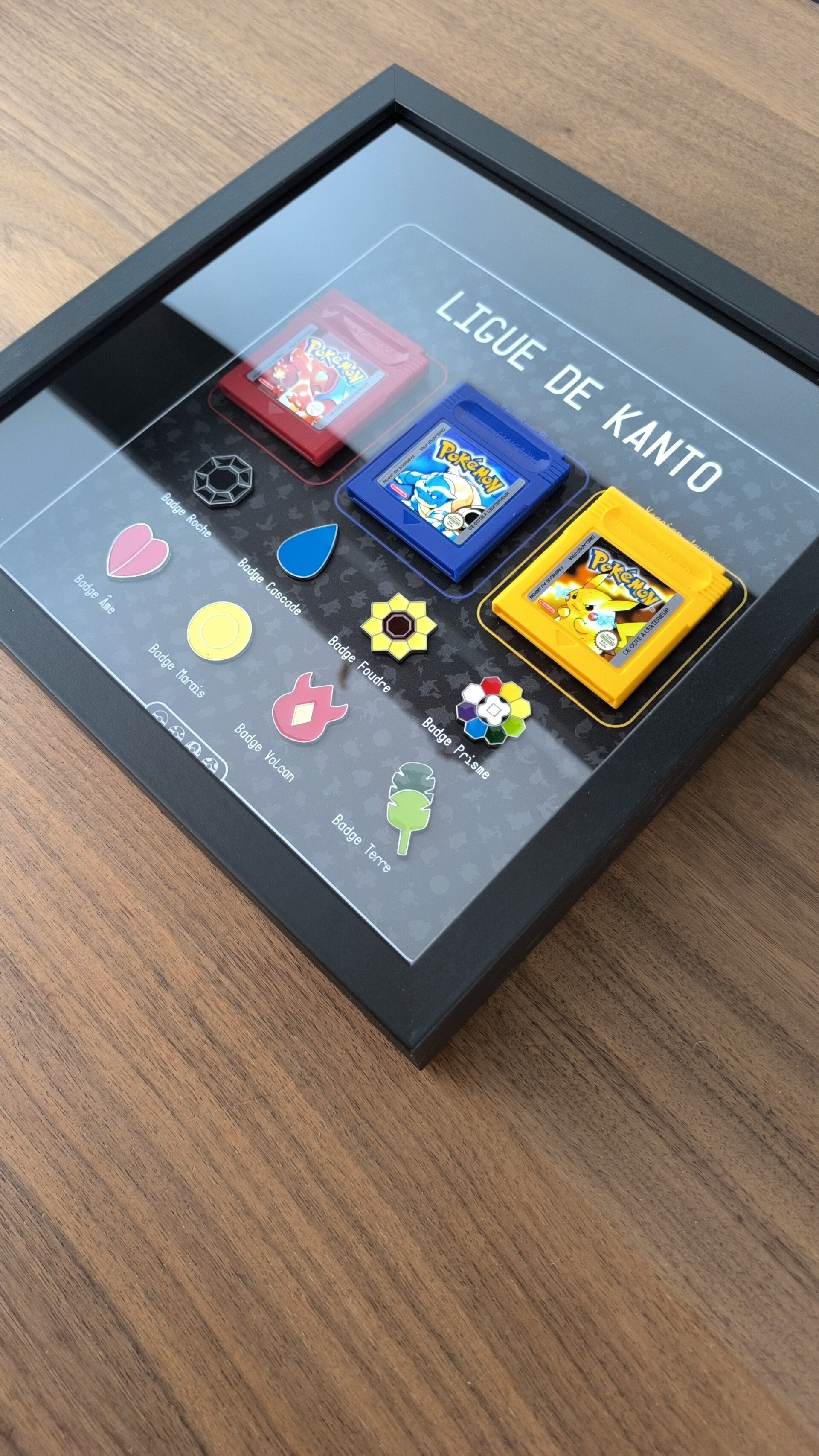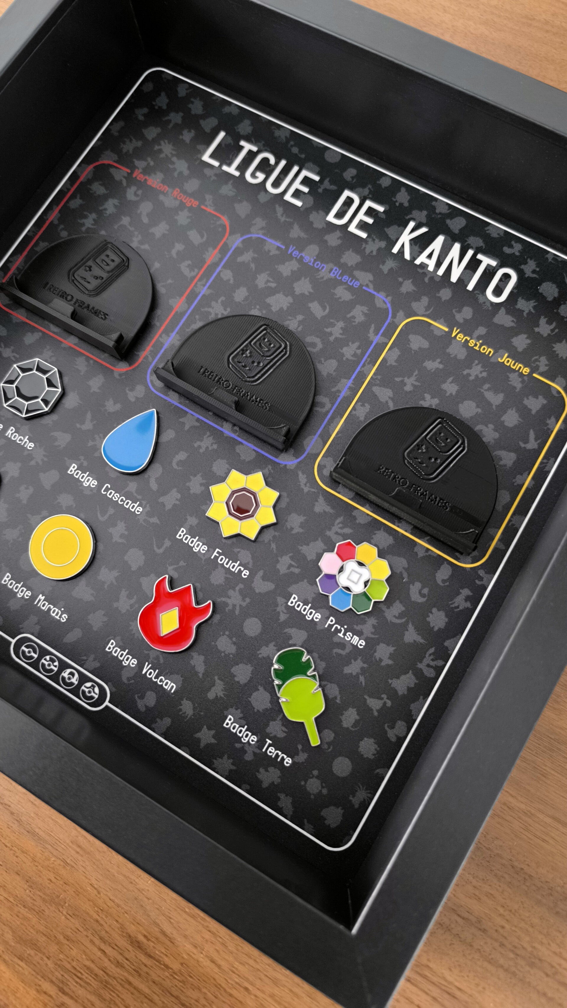 Pensé pour les vrais fans de Kanto, ce cadre met à l’honneur les 3 versions mythiques, les 8 badges officiels, la Ligue Pokémon et les ombres des 151 premiers Pokémon en arrière-plan.