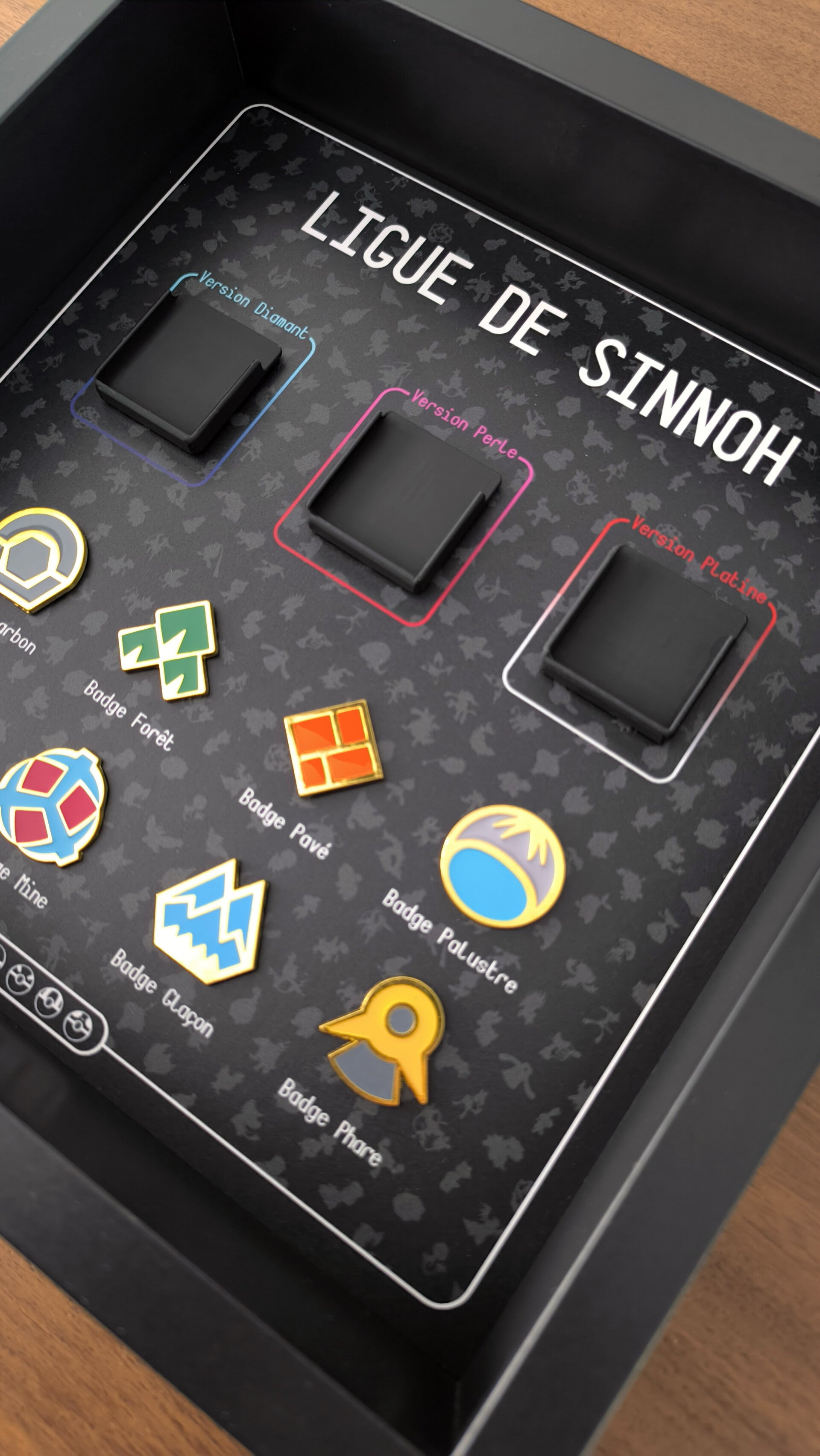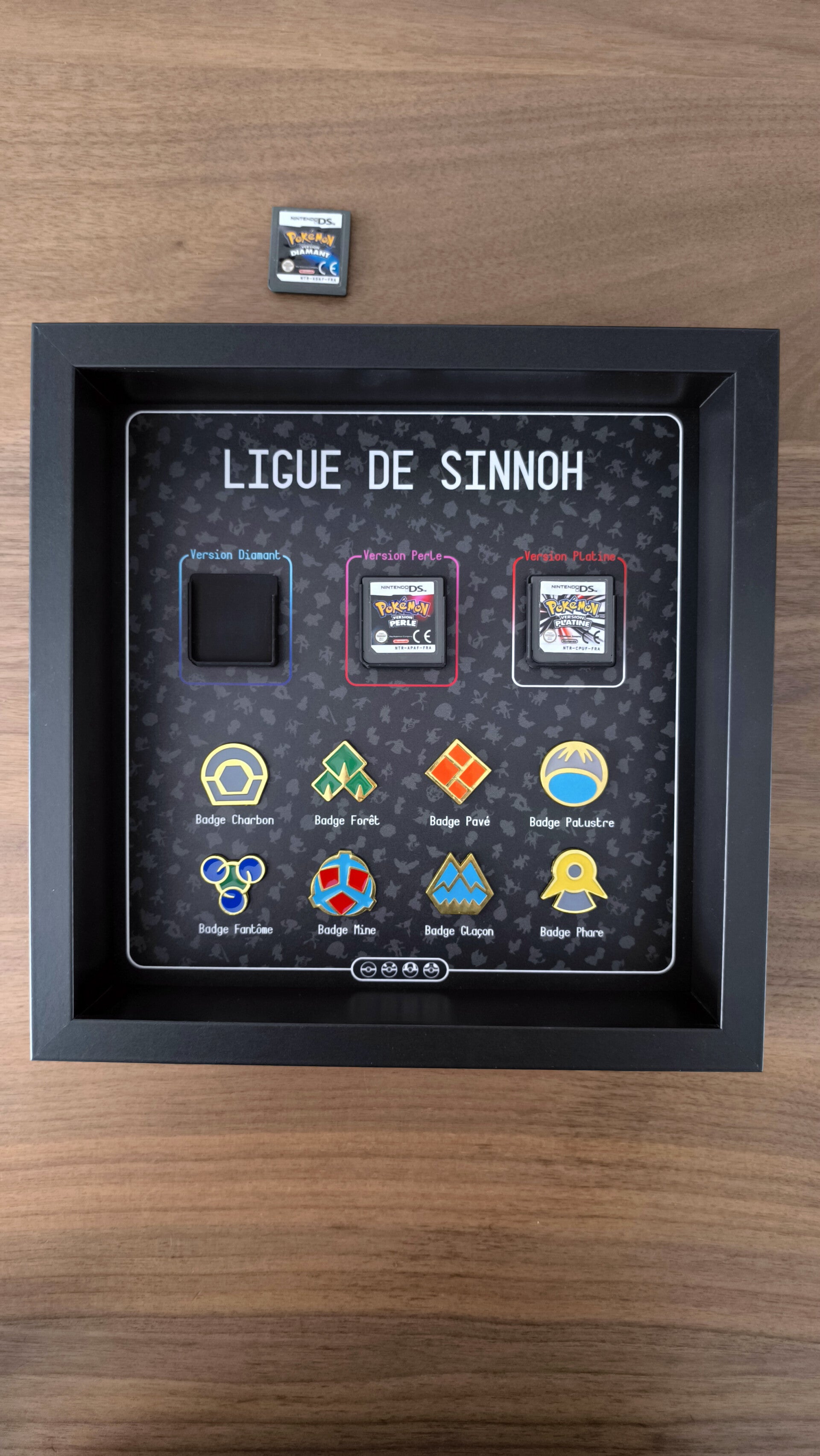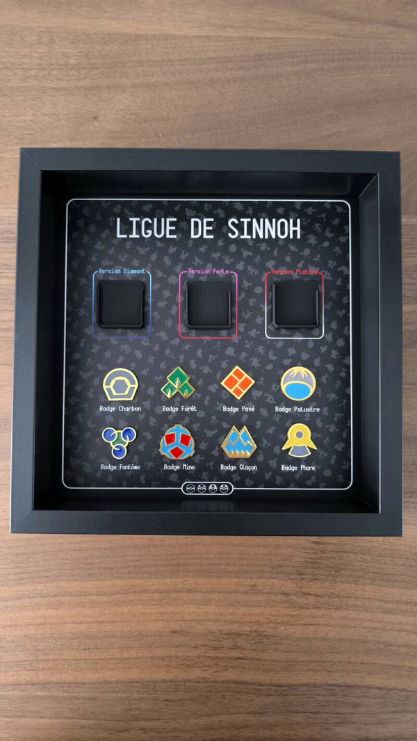 Pensé pour les fans de Sinnoh, ce cadre met à l’honneur les 3 versions emblématiques, les 8 badges officiels, la Ligue Pokémon et les 107 Pokémon introduits en Génération 4 en arrière-plan.