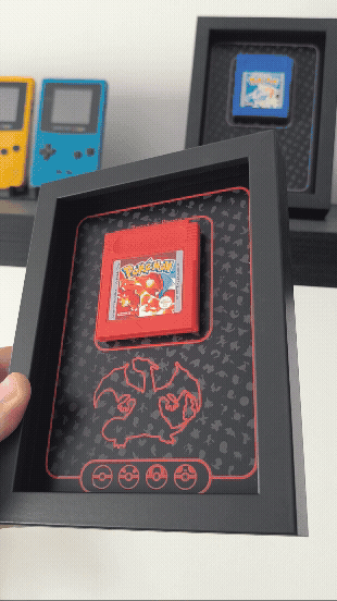 🎮 Les mini cadres Gameboy avec les versions Pokémon Rouge 🟥, Bleu 🟦 et Jaune 🟨 ! Cette fois-ci, une finition en relief premium est appliquée sur la couleur correspondant à chaque version, et les ombres des Pokémon viennent subtilement compléter l'arrière-plan pour un effet visuel unique.